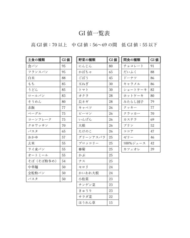 👉 アウトラインでは実際に「高GI・低GI食品の一覧表」を食事指導の際にお客様へお渡ししています。