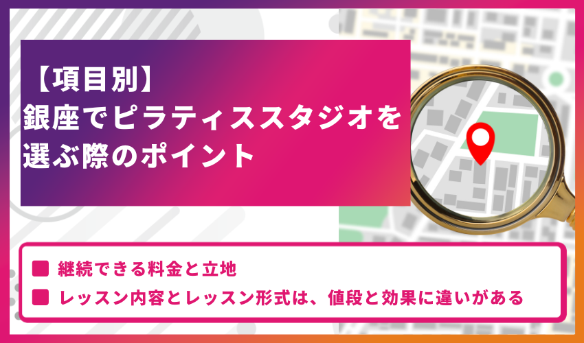 ピラティススタジオの選び方と、銀座のおすすめスタジオを紹介しました。